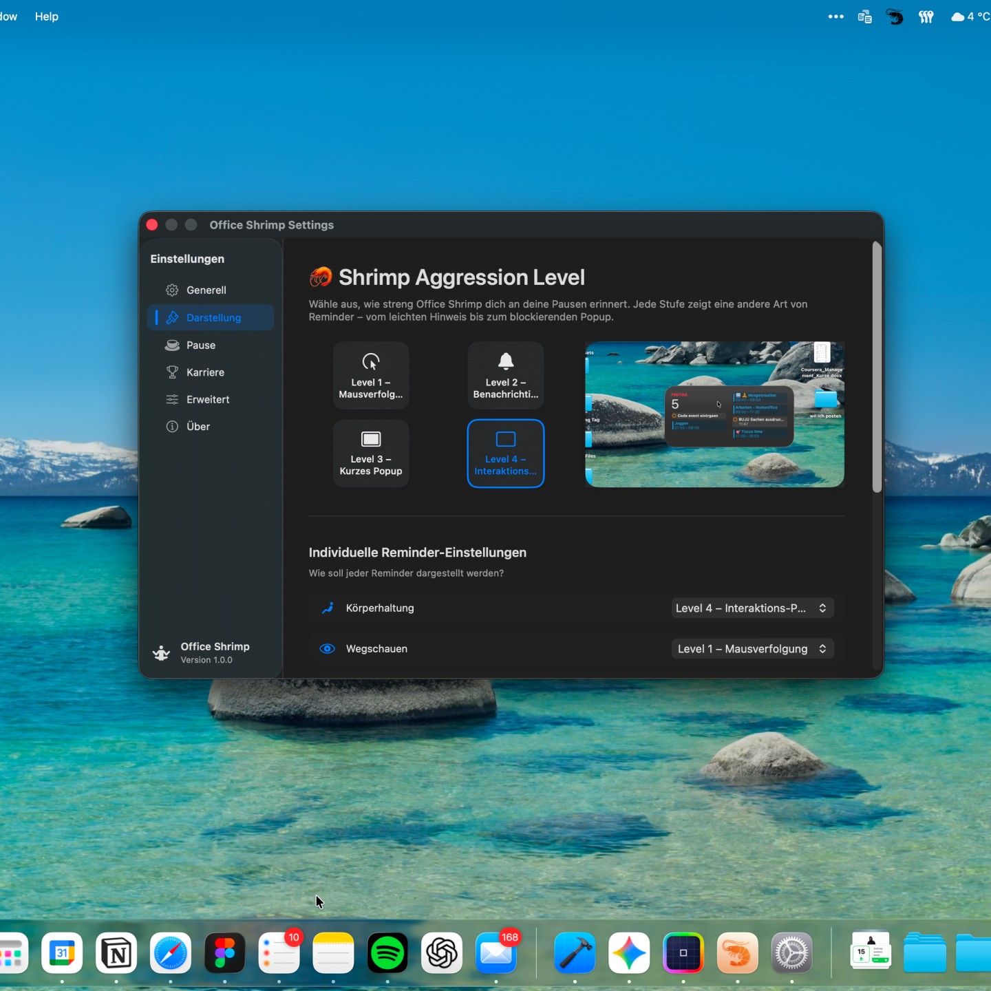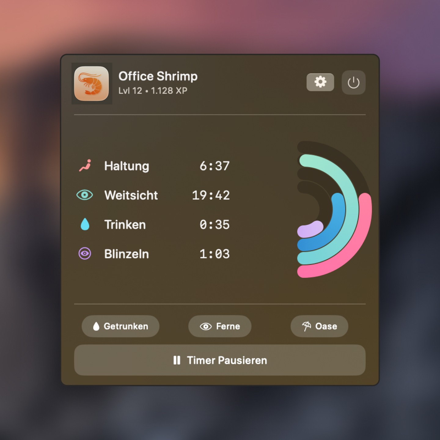 Office Shrimp ist eine native macOS-App, die in der Menüleiste lebt und dem Nutzer spielerisch zu einer besseren Körperhaltung verhilft.